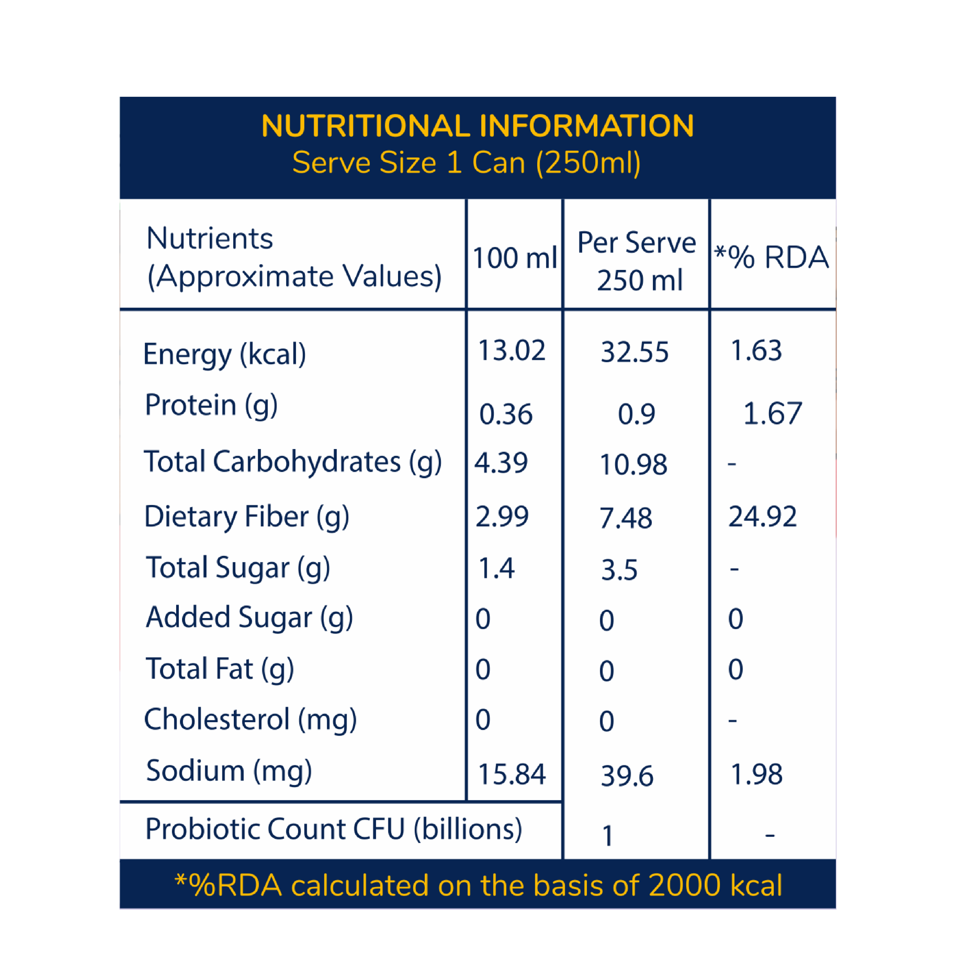 Carbonated RO Water, Inulin, Lemon Concentrate, Citric Acid (INS 330), Flavour (Blueberry, Lemon), Stevia (INS 960), Colour (INS 163), Himalayan Pink Salt, Probiotic (Bacillus subtilis – 10⁹ CFU per 250 ml), Monk Fruit Extract.